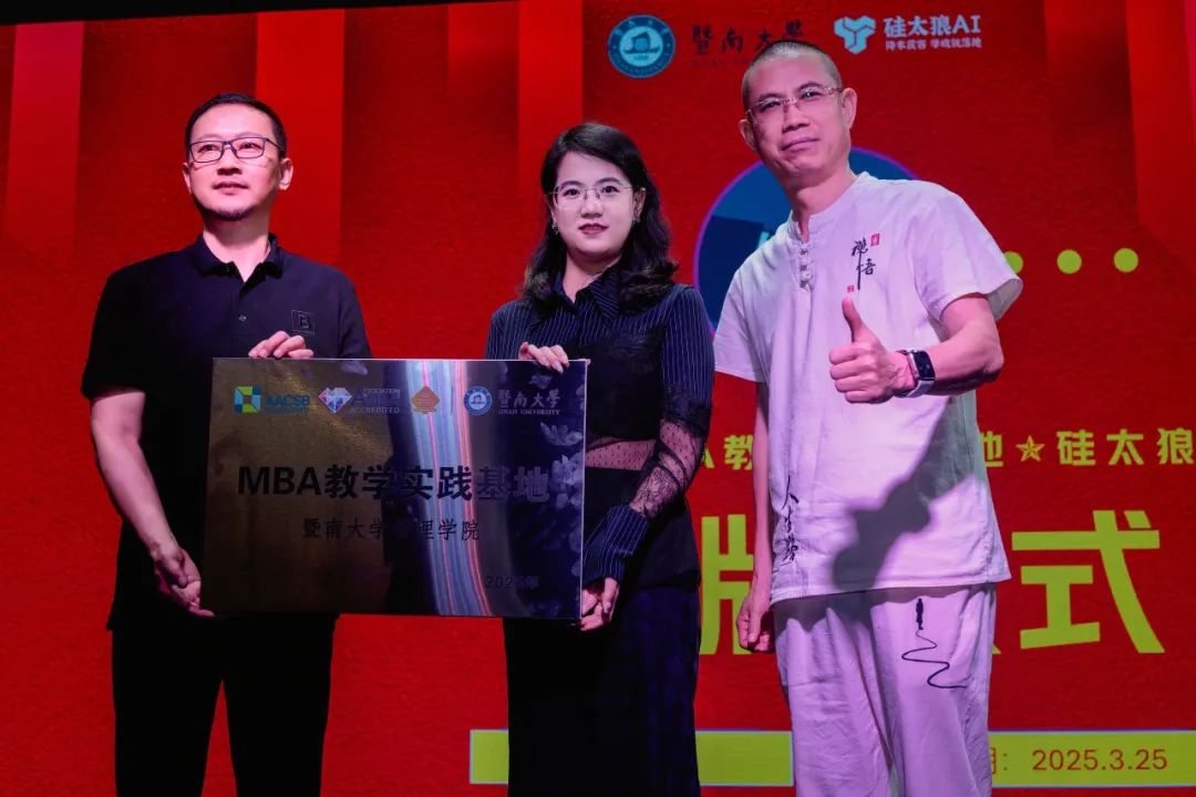 暨南大学MBA中心为硅太狼科技授予“暨南大学MBA实践教学基地”牌匾,双方将在AI教育、人才孵化、行业研究等方面深化协作,为MBA学生搭建更多与前沿产业融合的实战平台。