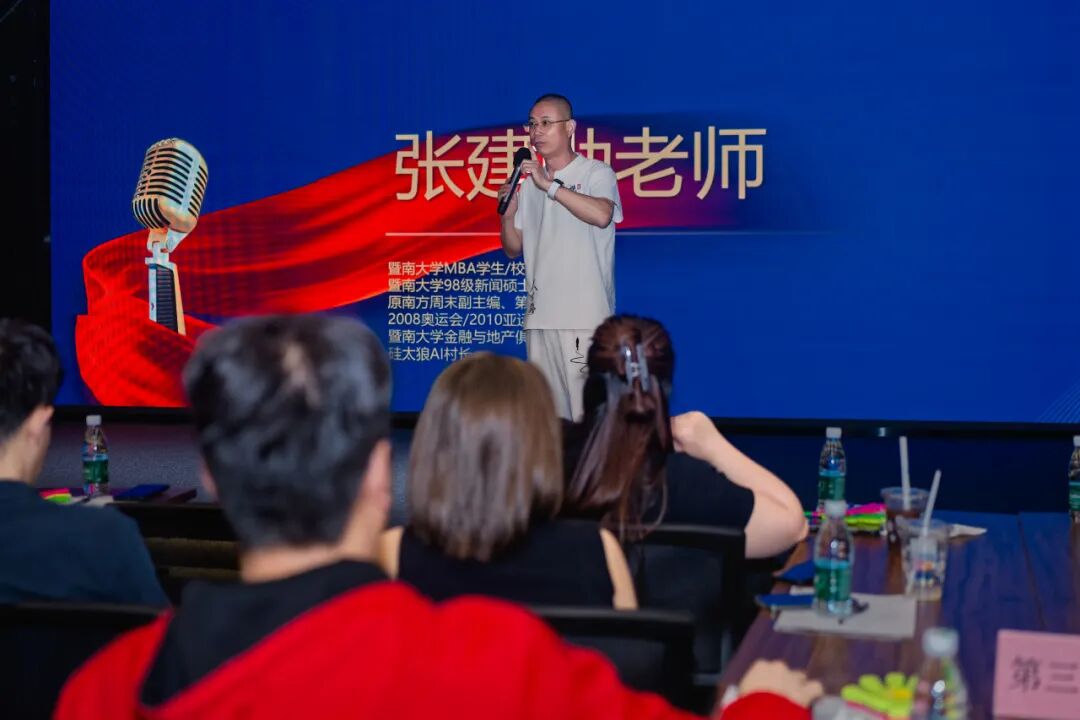 98级校友与校外实践导师张建勋结合自己从媒体到地产再到创业的多次转型,直言“未来属于能驾驭AI的人”,强调了AI能力在职场的高度“含氧量”。