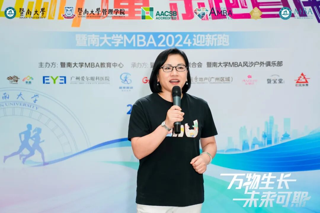 活动伊始,暨南大学管理学院党委书记区向丽为本次比赛致辞。区书记首先对参与本次活动的MBA新生、校友及赞助商嘉宾表示热烈欢迎!她表示,MBA首届迎新跑,是祝贺管理学院MBA迎来新的血液与希望,希望同学们能传承“奔跑不止、拼搏不息”的体育精神,成为不甘平庸、不愿平躺、不会服输的奔跑者,向着更加美好的未来奋勇前行!
